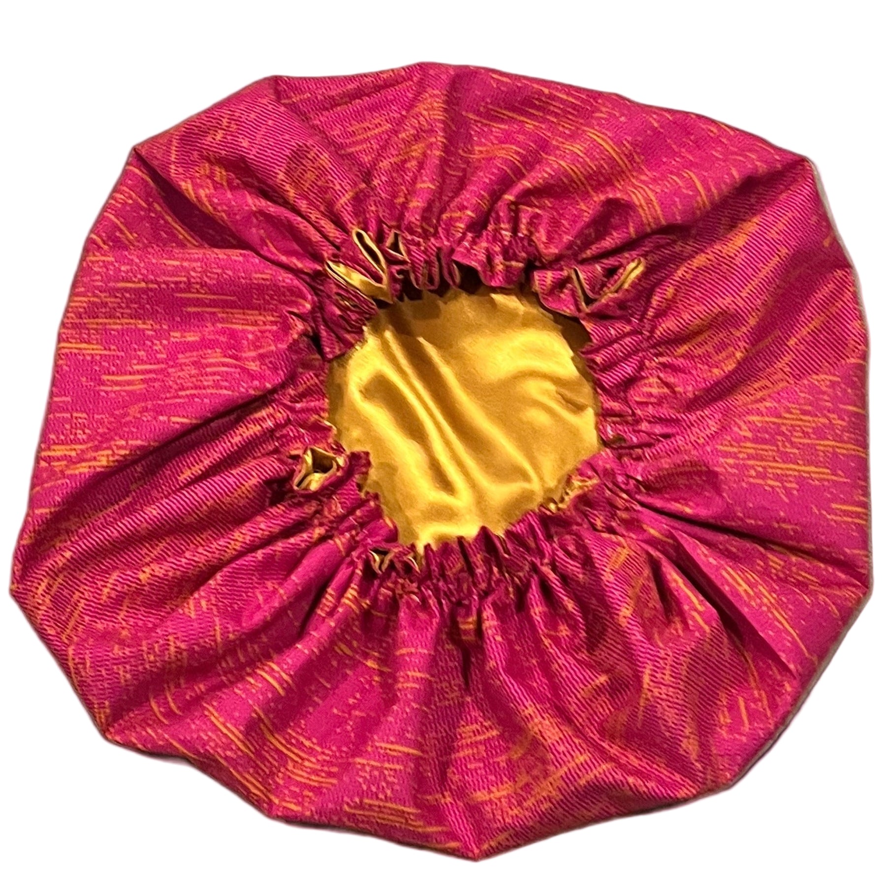 A medium-sized bonnet that’s lined with satin fabric. Hand wash with cool water when cleaning and air dry to prevent damage to fabric.